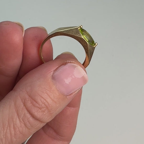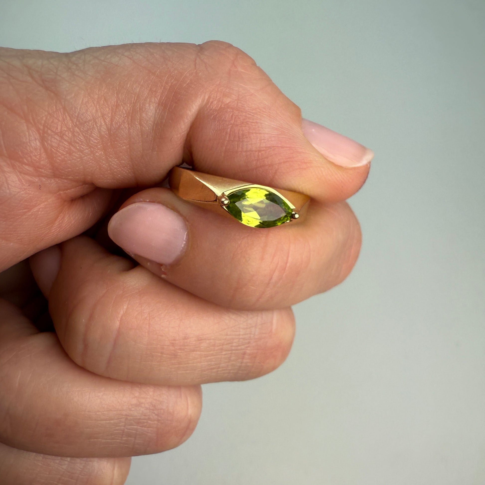 A charming 14K yellow gold estate ring featuring a lively marquise-cut peridot set in a striking east-west orientation. The peridot’s bright apple-green glow is framed by sculpted, angled shoulders that lend the piece a touch of architectural interest and personality. Warm, vibrant, and full of quiet character, it is perfect worn alone or stacked for a soft pop of color.