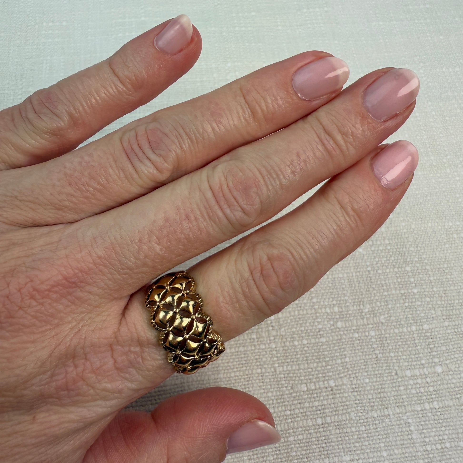 The estate ring features a wide open-work lattice design crafted in warm 10-karat yellow gold. The repeating diamond-shaped pattern creates an airy, filigree-style look with beautiful dimension and light play across the surface. The ring tapers smoothly at the shoulders for a comfortable fit while maintaining a bold presence on the hand. A timeless and versatile statement band that is feminine, sculptural, and perfect worn solo as a standout piece or styled alongside your other favorite rings.