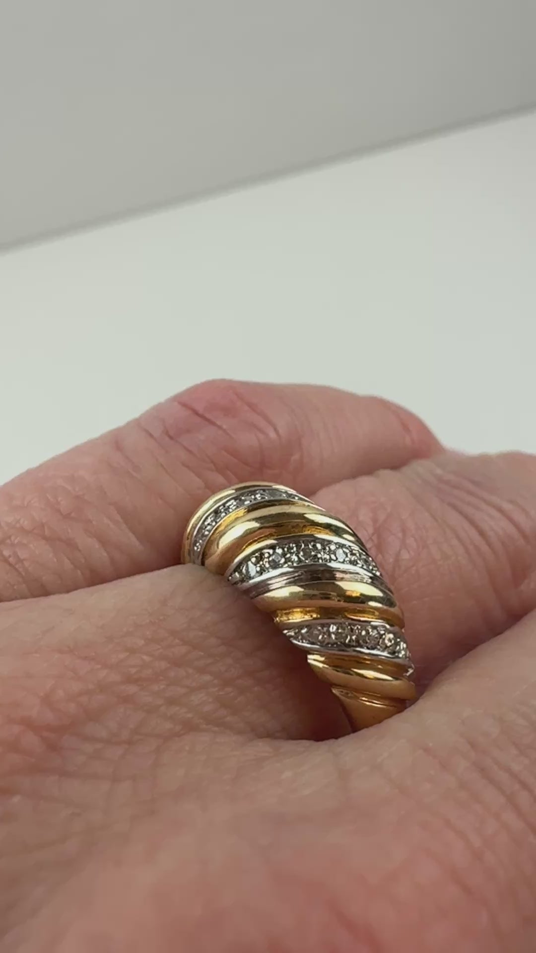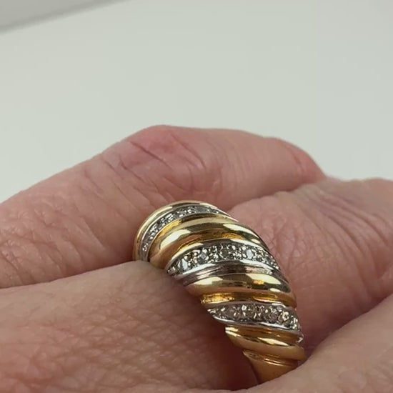 This estate croissant-style ring is crafted in solid 10K yellow gold and features a bold, sculptural swirl design that wraps gracefully across the finger. Alternating polished gold ribbons are accented with rows of small round diamonds, adding subtle sparkle and texture throughout.