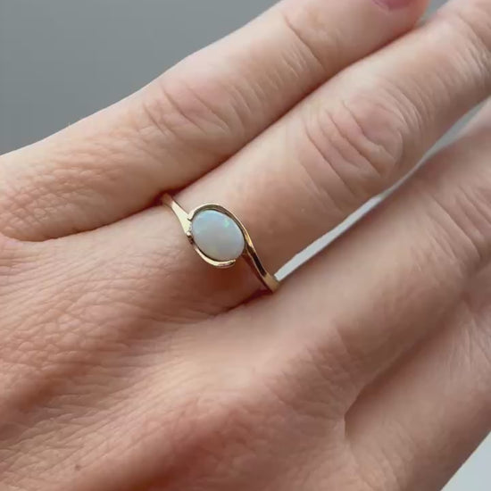 This charming vintage opal ring features an elegant east-west oval design in a semi-bezel setting. Full of character and personality, it’s a truly timeless piece.