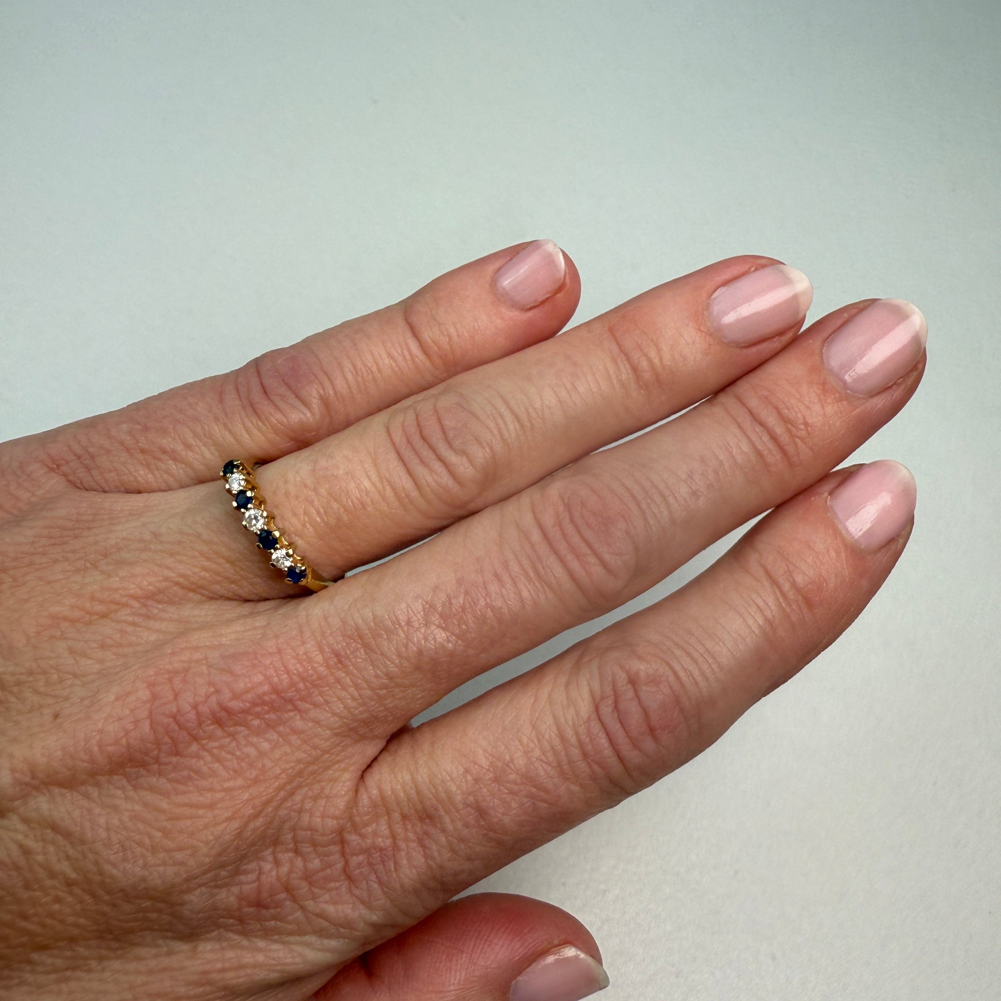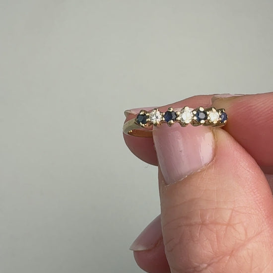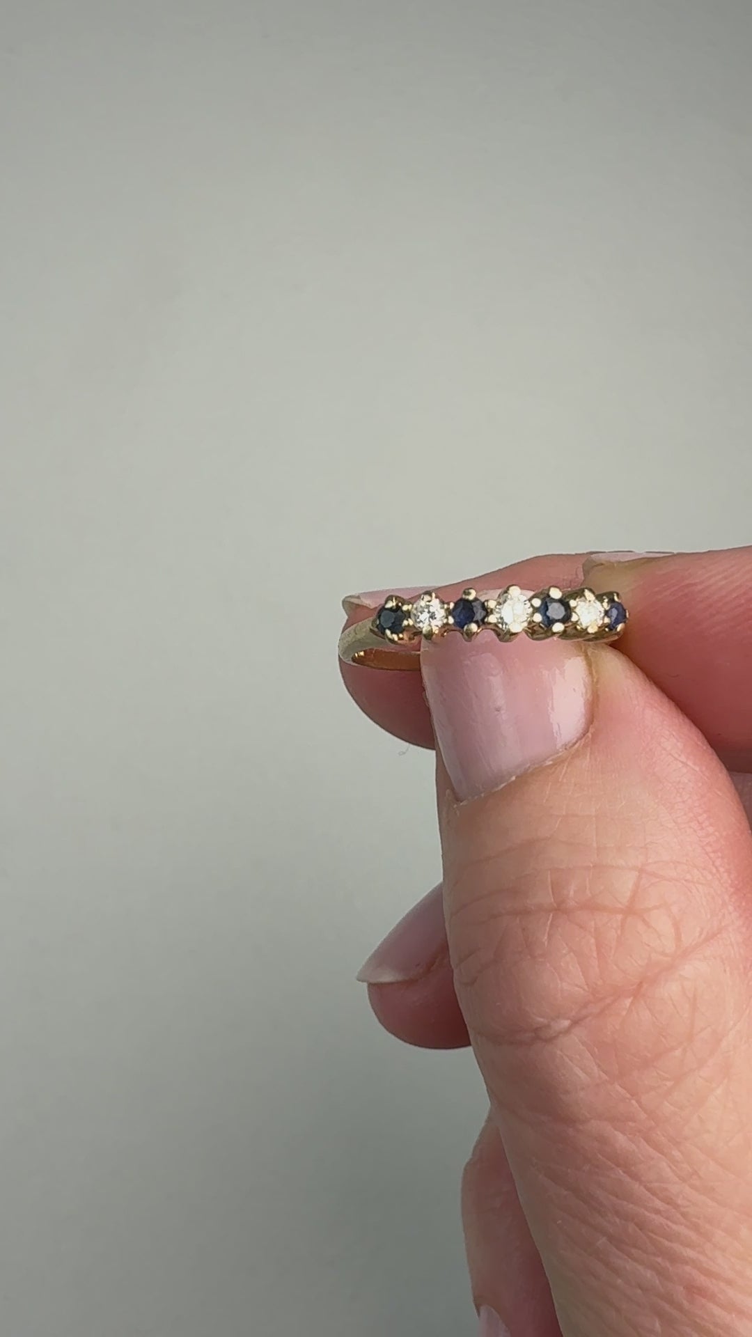 A lovely vintage 10K yellow gold band featuring an alternating pattern of deep blue sapphires and bright white diamonds, each set in delicate prong settings. The contrast of sapphires and diamonds creates a classic mid-century eternity-style look, perfect for stacking or wearing solo.