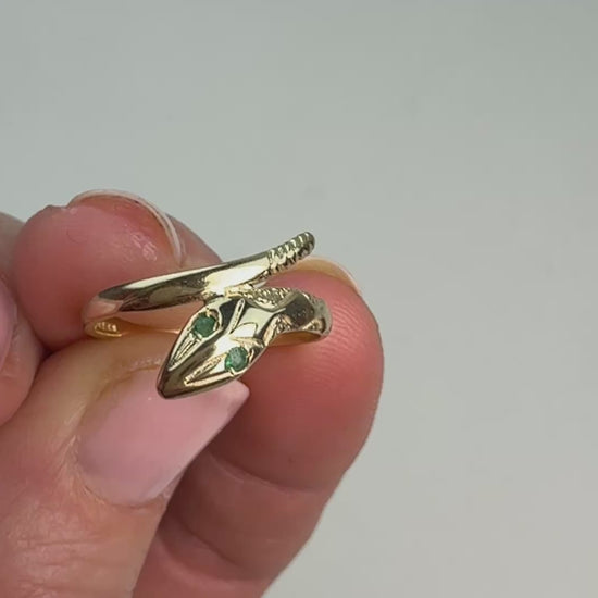 A striking 9K yellow gold snake ring with glowing emerald eyes and engraved scale detailing—coiled, symbolic, and full of vintage personality.