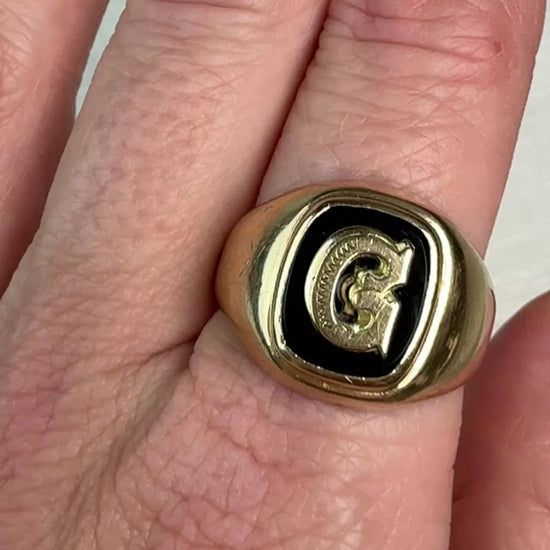 This vintage 10K yellow gold signet ring features a bold, classic shield-shaped face with a raised engraved G monogram set against a glossy black onyx background. The contrast gives the ring a strong, timeless look with great presence on the hand. The ring has smooth, tapering shoulders and a comfortable, low-profile fit, making it ideal for everyday wear or as a meaningful heirloom piece. It is stamped 10K PS COMPANY, indicating solid 10-karat gold and manufacture by a registered jewelry house. A handsome, character-filled vintage signet ring, perfect for a collector, a gift, or anyone with a meaningful connection to the letter G.
