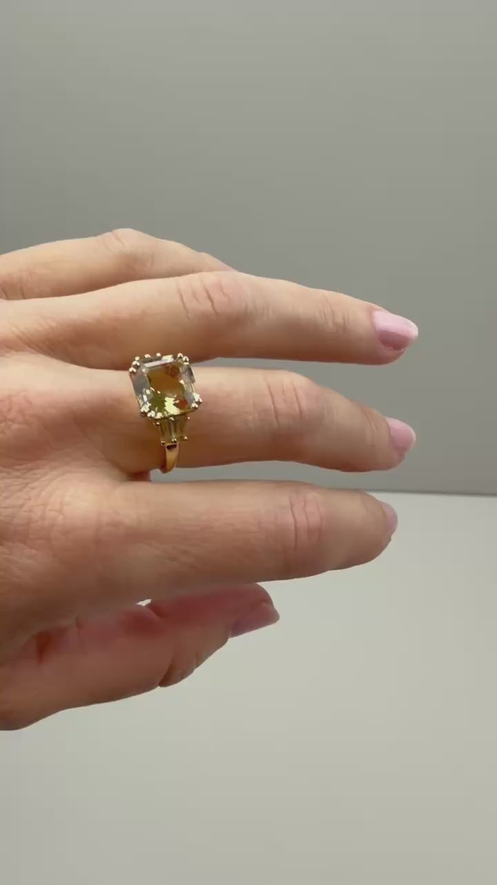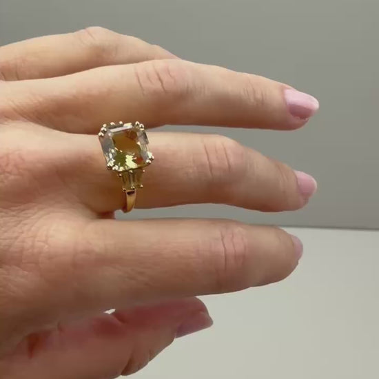 An elegant ring featuring a captivating 10mm Citrine gemstone flanked by tapered baguettes. The open basket setting allows light to dance through every facet, creating that signature Asscher glow. A classic silhouette with influences of art deco and mid-century design with timeless sophistication. It is bold yet refined.