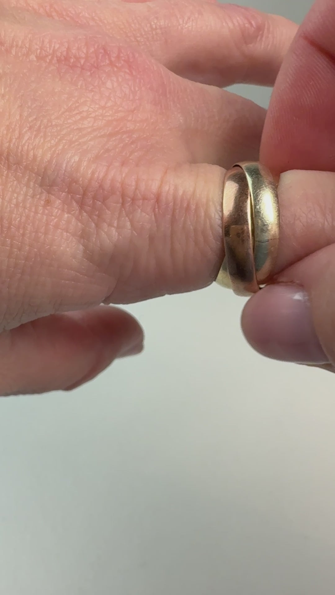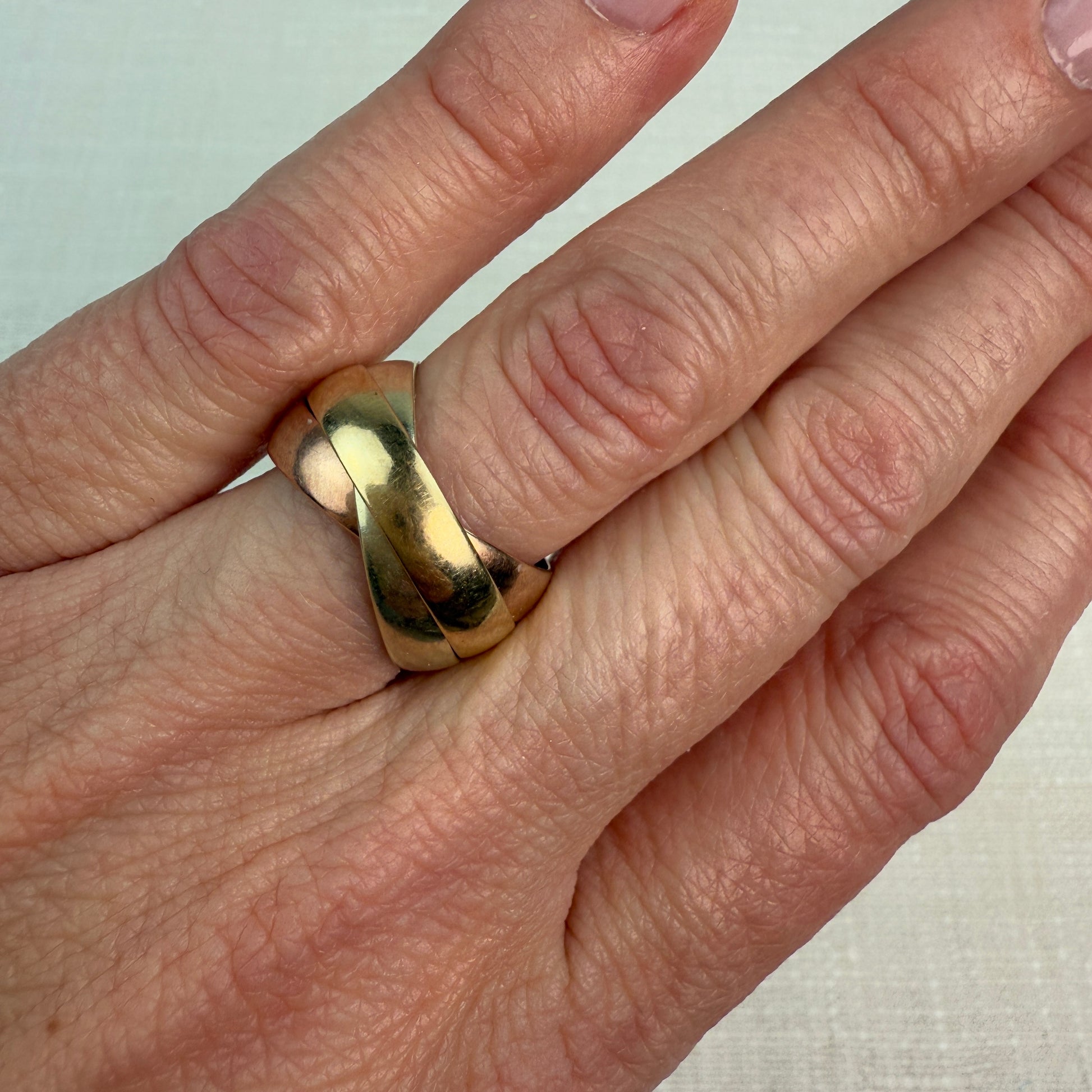 This vintage 9K rolling ring features three interlocking bands in yellow, white, and rose gold, creating a beautiful tricolor look with a soft, warm patina from age and wear. Each band moves independently, giving the ring its classic rolling, or Russian wedding band, style that feels smooth and comfortable on the finger while symbolizing connection and unity. A charming vintage staple with character and history, perfect for collectors and gold lovers alike..
