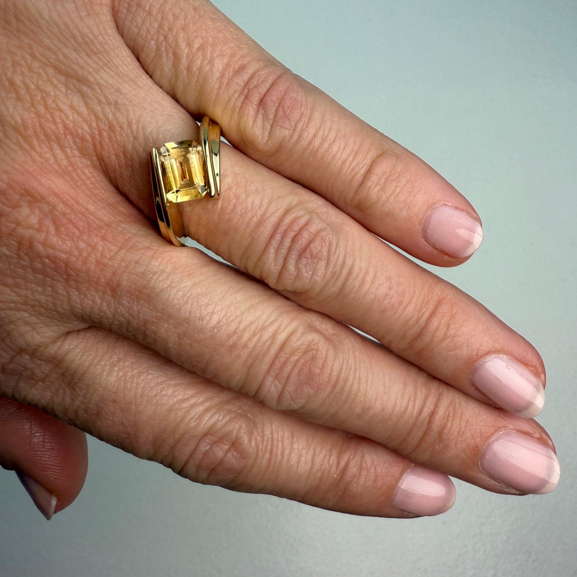 This striking 10K yellow gold ring showcases a beautifully cut light golden citrine set in an open, sculptural bypass design. The emerald-cut citrine sits horizontally between two polished gold panels, creating an eye-catching architectural silhouette. The honey-gold hue of the stone pairs perfectly with the warm 10K gold, giving the piece a sleek, modernist feel with vintage charm.