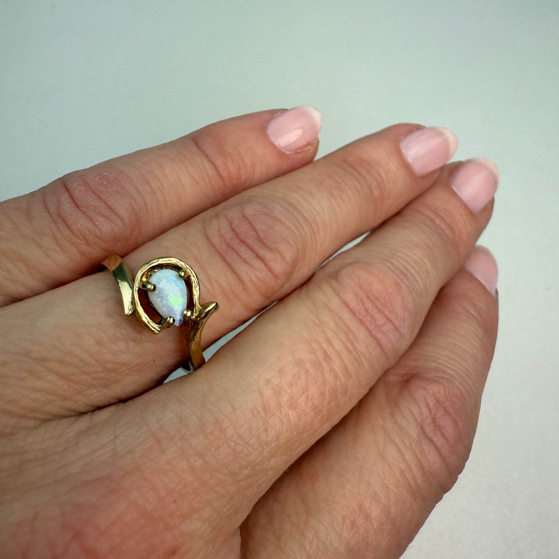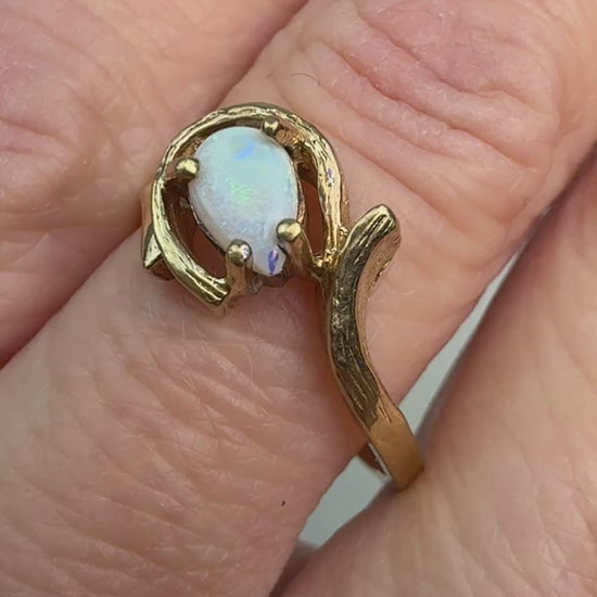 This vintage ring is crafted in solid 10K yellow gold and features a softly glowing opal set within a sculptural mid-century design. The opal has a luminous, translucent body with gentle flashes of green, blue, and subtle pink that shift beautifully in the light. The setting showcases a distinctive mid-century bark, or wood-grain, finish—a hallmark of the era that adds texture and an organic, hand-wrought feel. Rounded prongs secure the opal, while the asymmetrical gold surround evokes natural forms, echoing the earthy, nature-inspired aesthetic popular in mid-century jewelry.