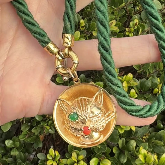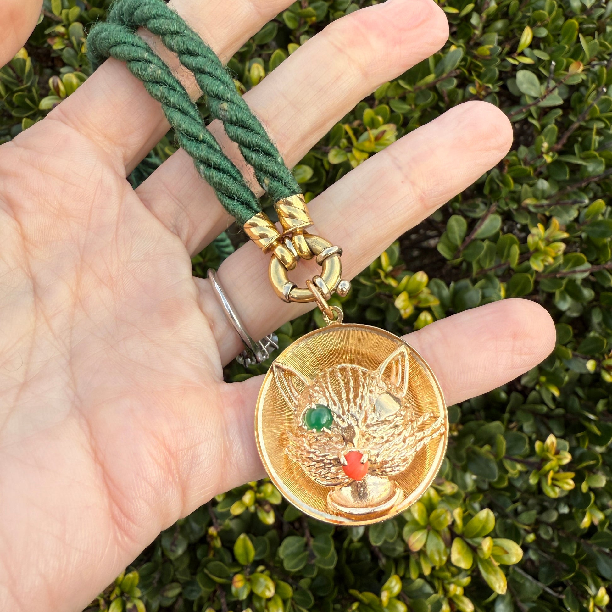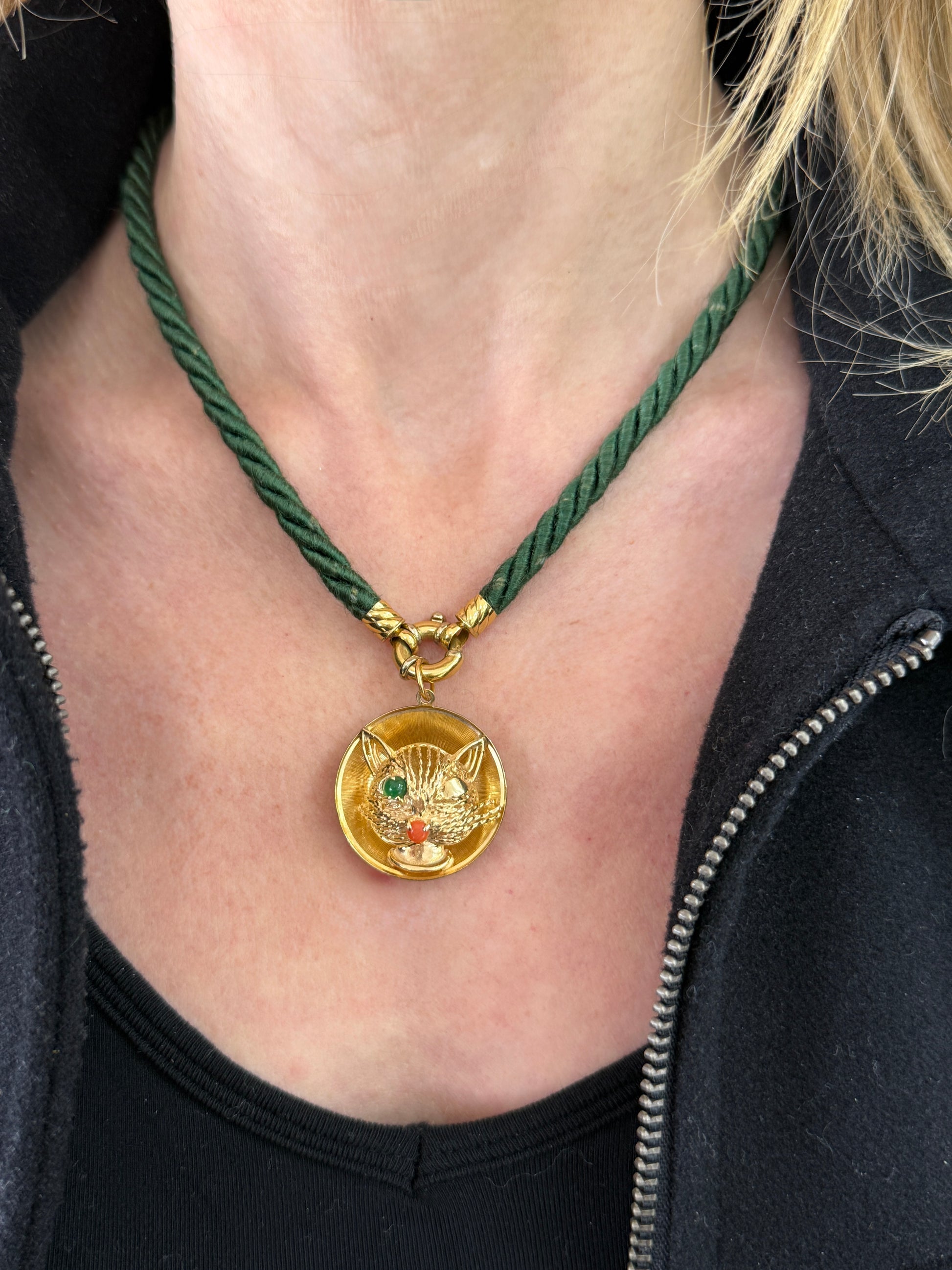 This estate silk cord is such a beautiful way to style your favorite charms and pendants. The deep green silk is twisted for a soft, luxurious texture and rich color, giving it that elevated vintage feel. It’s finished with a substantial 13mm 14K gold bolt clasp — perfect for attaching charms or wearing as a standalone statement. At 17.5 inches, it sits nicely at the collarbone and adds a chic pop of color to any stack.