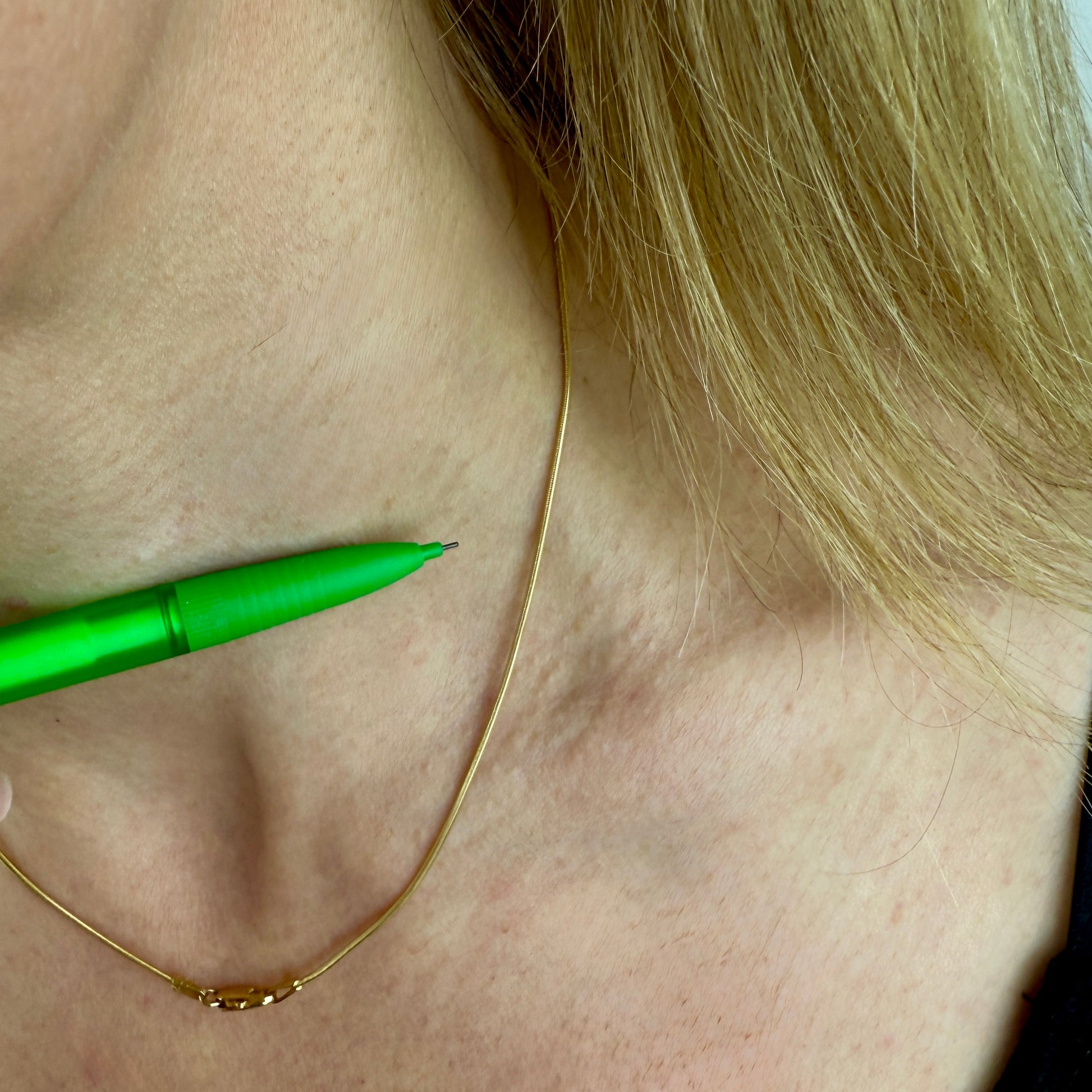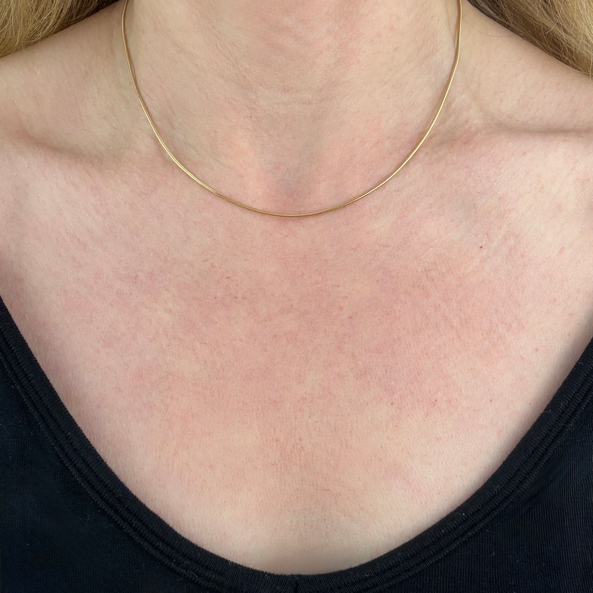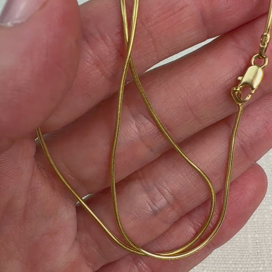 This 14K yellow gold snake chain has a smooth, silky drape with a sleek, continuous profile that reflects light beautifully. The classic snake-link design lays softly against the skin and feels comfortable and refined for everyday wear — a timeless, minimalist gold staple that looks elegant on its own or layered.