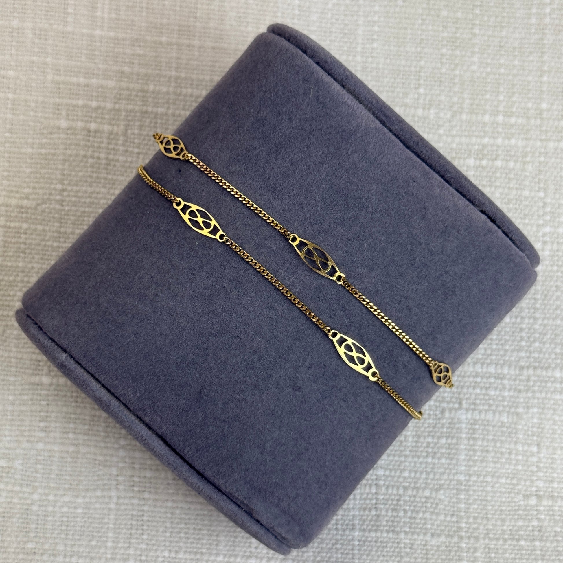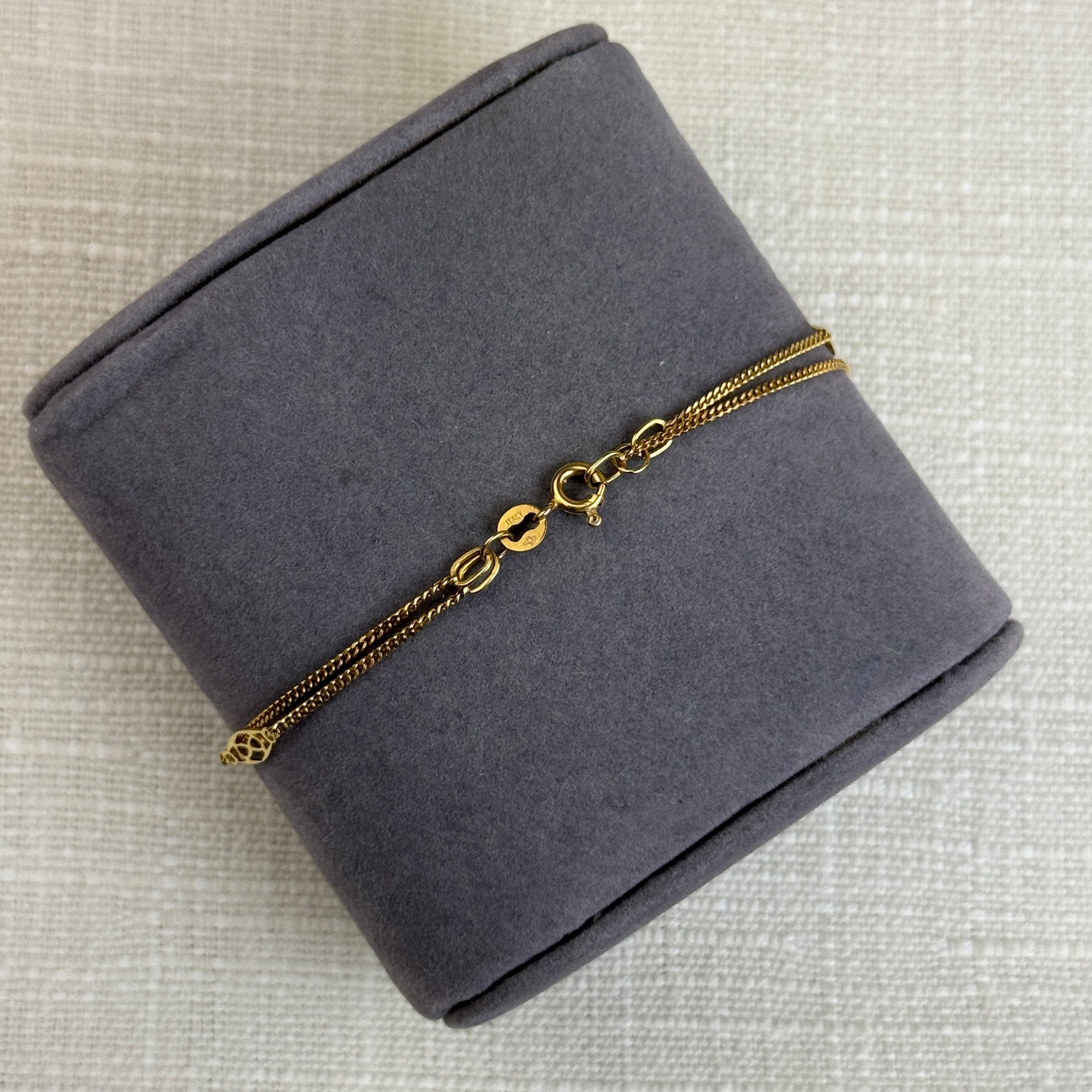 This vintage Italian-made 10K yellow gold bracelet features a graceful double-strand design accented with delicate filigree station links. The openwork filigree elements add lightness and visual interest, while the twin gold chains create soft movement and an elegant drape on the wrist. Carefully crafted with an artisan feel, this bracelet strikes a lovely balance between detail and wearability. Finished with a secure clasp, it's an understated yet distinctive vintage piece that layers easily or shines on its own.