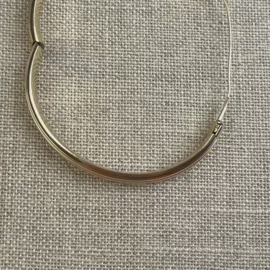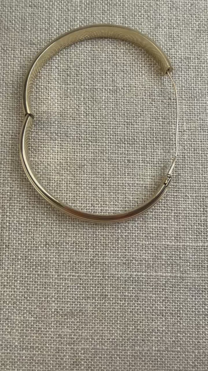 This timeless vintage oval bangle has a beautiful mid-century feel, highlighted by its clean linear grooves. It is in exceptional condition and has the perfect presence. It is bold enough to wear on its own, yet versatile enough to complement any bracelet stack. It is truly one of those pieces that will be hard to let go of. The push-button clasp with hinge and slide makes it easy to put on and secure to wear.