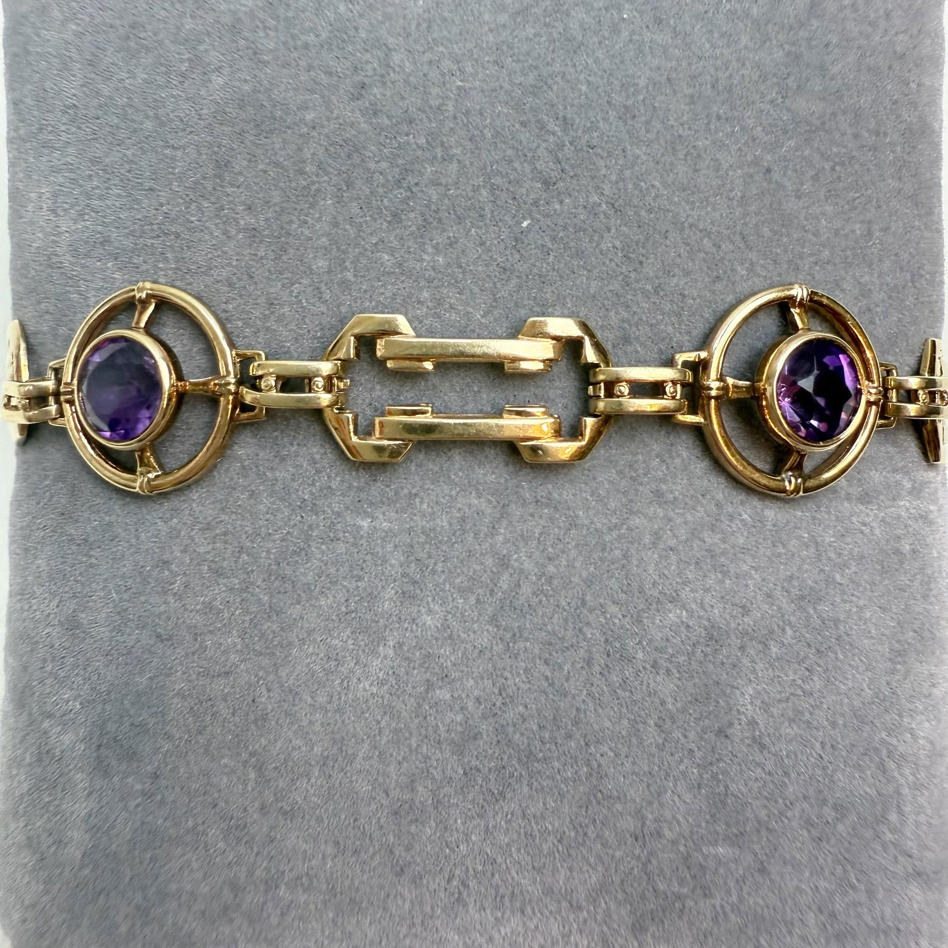 This intricate and unique design is truly breathtaking, showcasing a bold vintage aesthetic. The bracelet features a three-part repeating pattern: larger rectangular links with cut corners, shorter bar connector links, and circular medallion links set with bezel amethysts. The combination of links creates both visual interest and a fluid fit that contours beautifully to the wrist. Substantial yet refined, this piece feels luxurious and is sure to be a conversation starter.