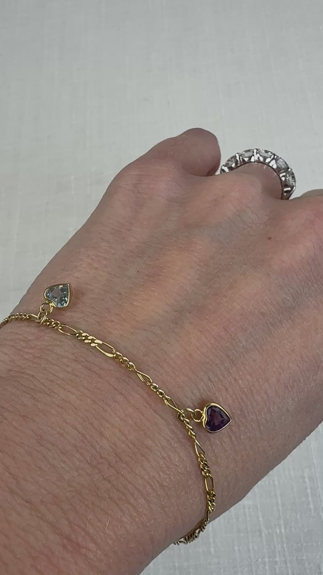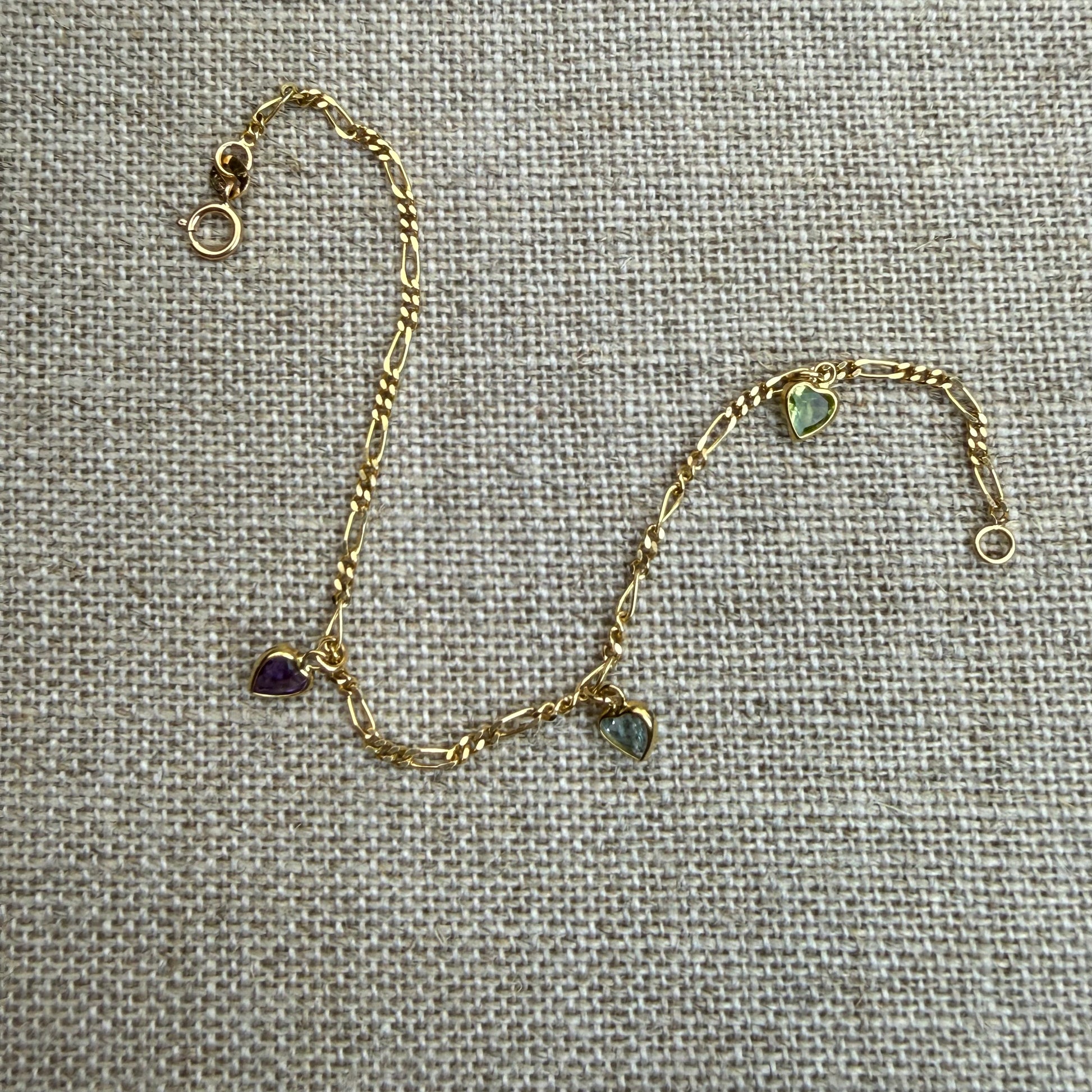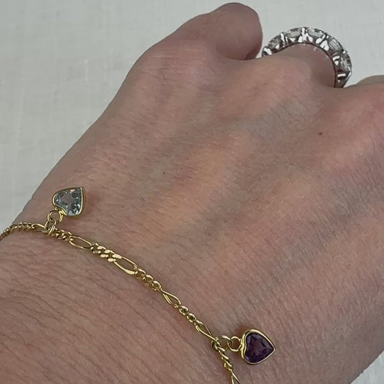 This elegant estate bracelet is crafted in 14-karat yellow gold and features a classic Figaro link design accented with three heart-shaped gemstones. The bracelet showcases a vibrant trio including blue topaz, amethyst, and peridot, each adding a soft pop of color along the chain. Each gemstone is set in a bezel-style front with prong-set backs, offering the smooth look of a bezel while still allowing light to pass through the stones. The Figaro links give the bracelet beautiful movement and a timeless feel, making it easy to wear on its own or layer with other gold pieces.