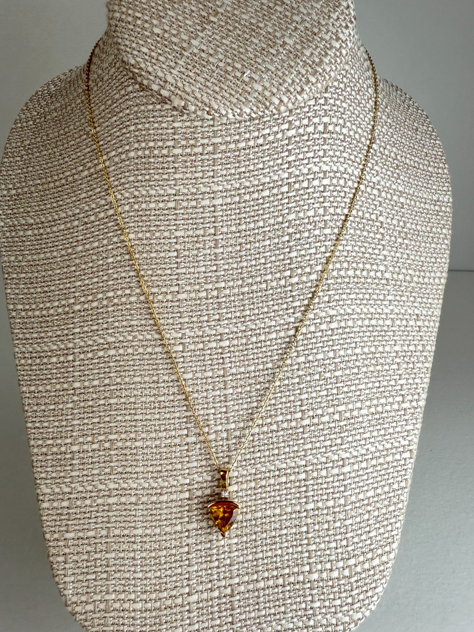 This elegant pendant features a vibrant trillion-cut citrine accented with sparkling diamonds, all set in warm 10K yellow gold. The golden hues of the citrine radiate warmth and positivity, while the diamonds add a touch of brilliance for a timeless and versatile look. Perfect for everyday wear or special occasions, this piece brings both color and sophistication to your jewelry collection.