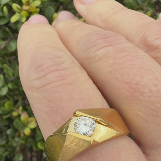 This is such a striking vintage-inspired ring with a bold, geometric 14K gold design featuring sharp, modern lines that frame a brilliant round diamond at the center. The mix of high-polish and brushed finishes gives it incredible dimension and makes the diamond pop even more. It has that perfect mid-century-meets-contemporary feel, and the profile is so flattering on the hand — a genuine statement piece with excellent presence.