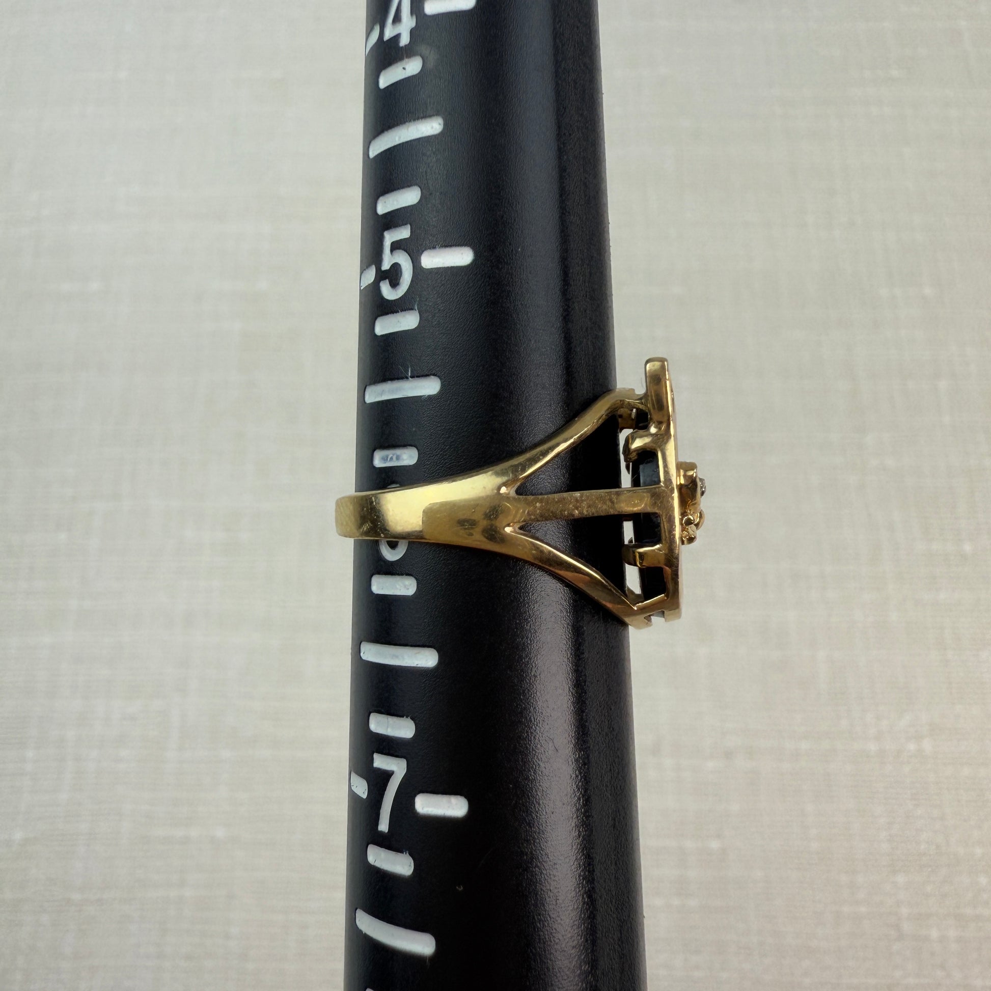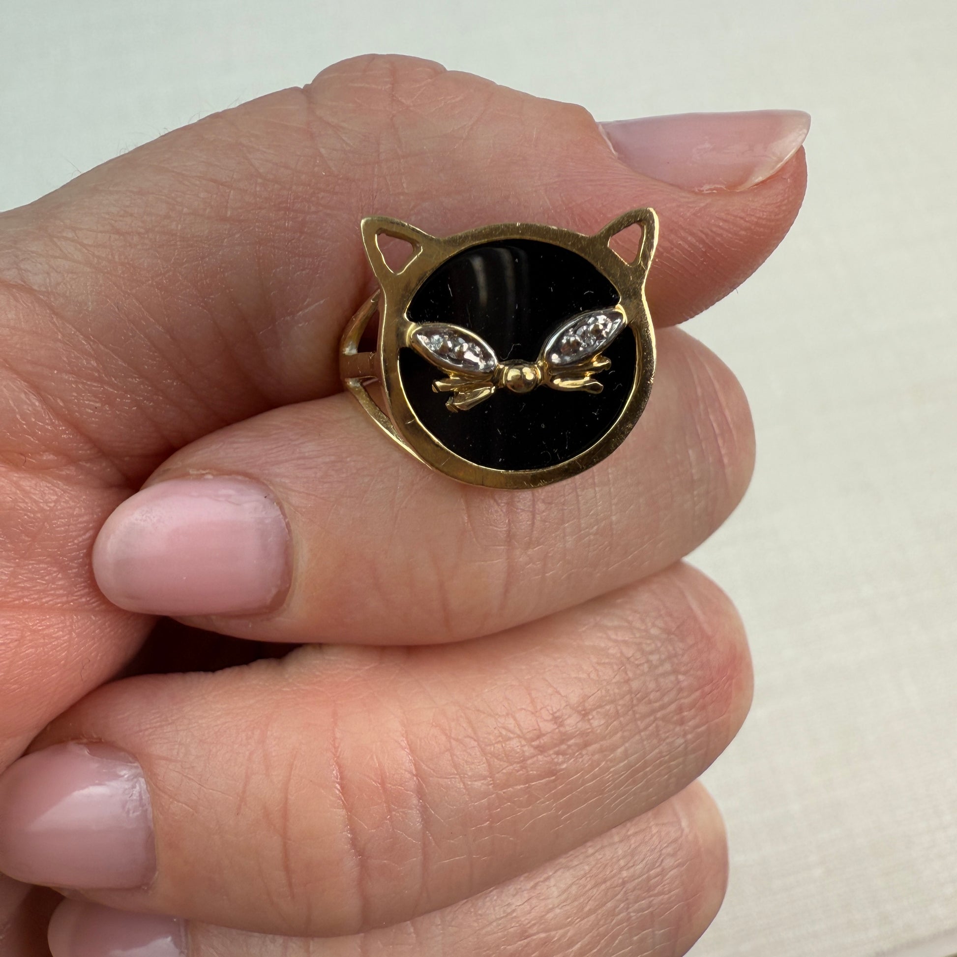 Vintage 10K Solid Yellow Gold and Onyx Cat Ring with Diamond Accent Size 6