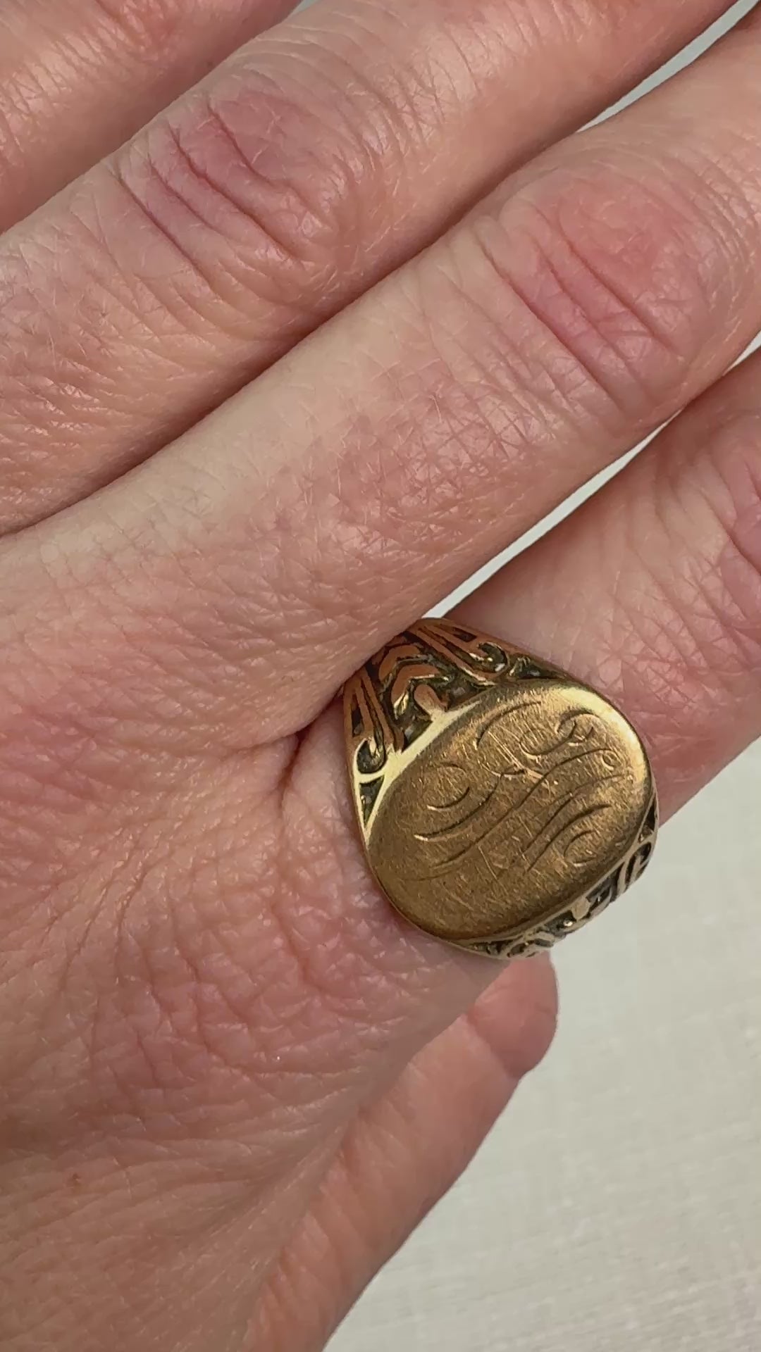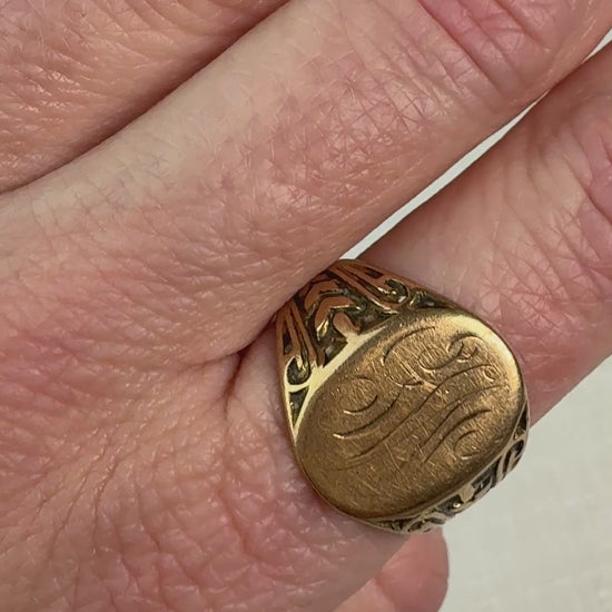 This vintage 14K gold signet ring features a warm satin-finish oval face engraved with an elegant script monogram, giving the piece a timeless heirloom feel. The shoulders are richly detailed with sculptural, Art Deco–inspired relief work that flows seamlessly into the band, adding visual depth and character. Substantial in weight at 5.93 grams, the ring has a solid, comfortable presence on the hand while maintaining a low-profile fit suitable for everyday wear. Light surface wear is consistent with age and adds to its vintage charm. A beautiful piece with personality and history, perfect as a statement ring or an addition to a curated gold collection.
