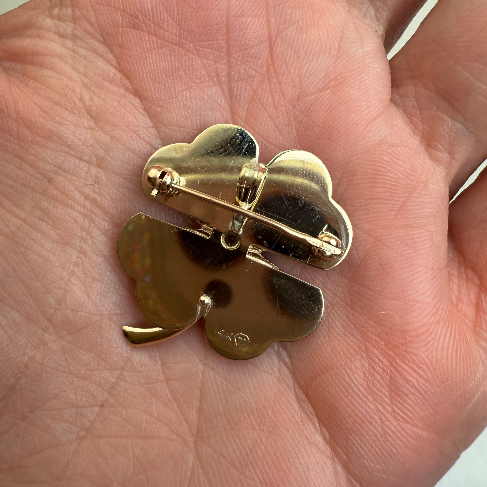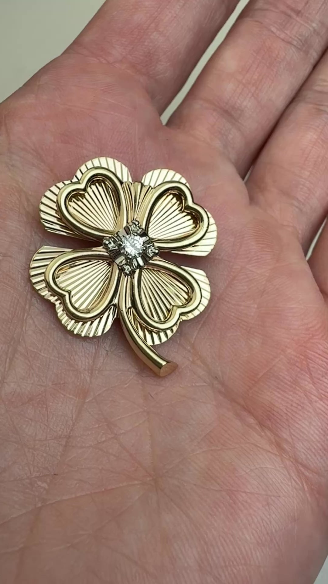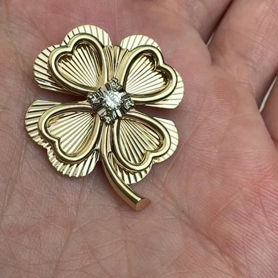 Estate 14K vintage engine-turned four-leaf clover with Diamond, 7.11 grams